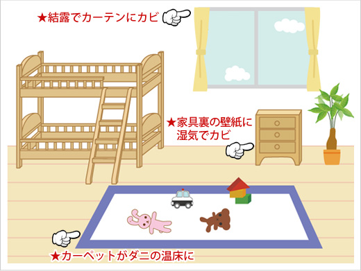 そして、カビ・ダニは喘息やアレルギー・皮膚疾患などをひきおこし、健康に大きな被害をもたらす恐れがあります。