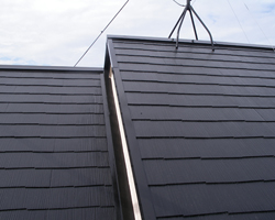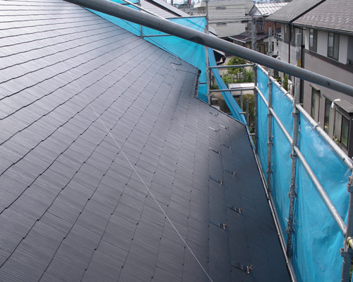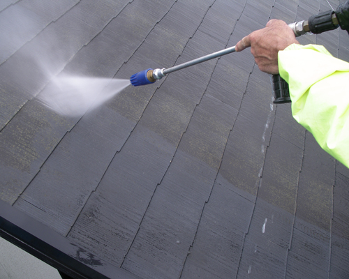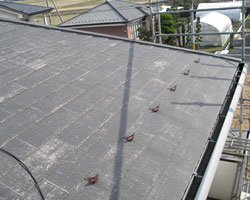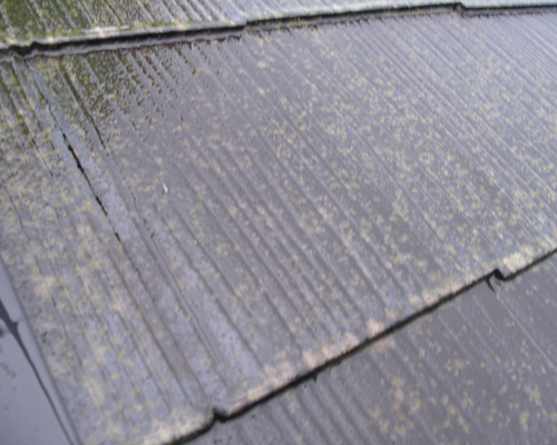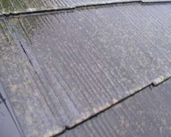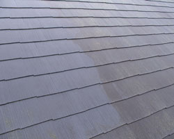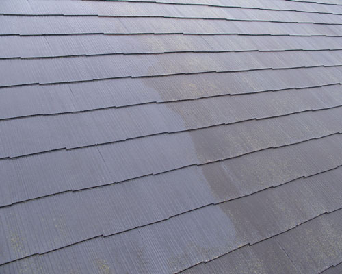 | 施行前のコロニアル屋根材です。防水性が切れたためコケがはえています | 高圧洗浄で汚れを洗い除きます |